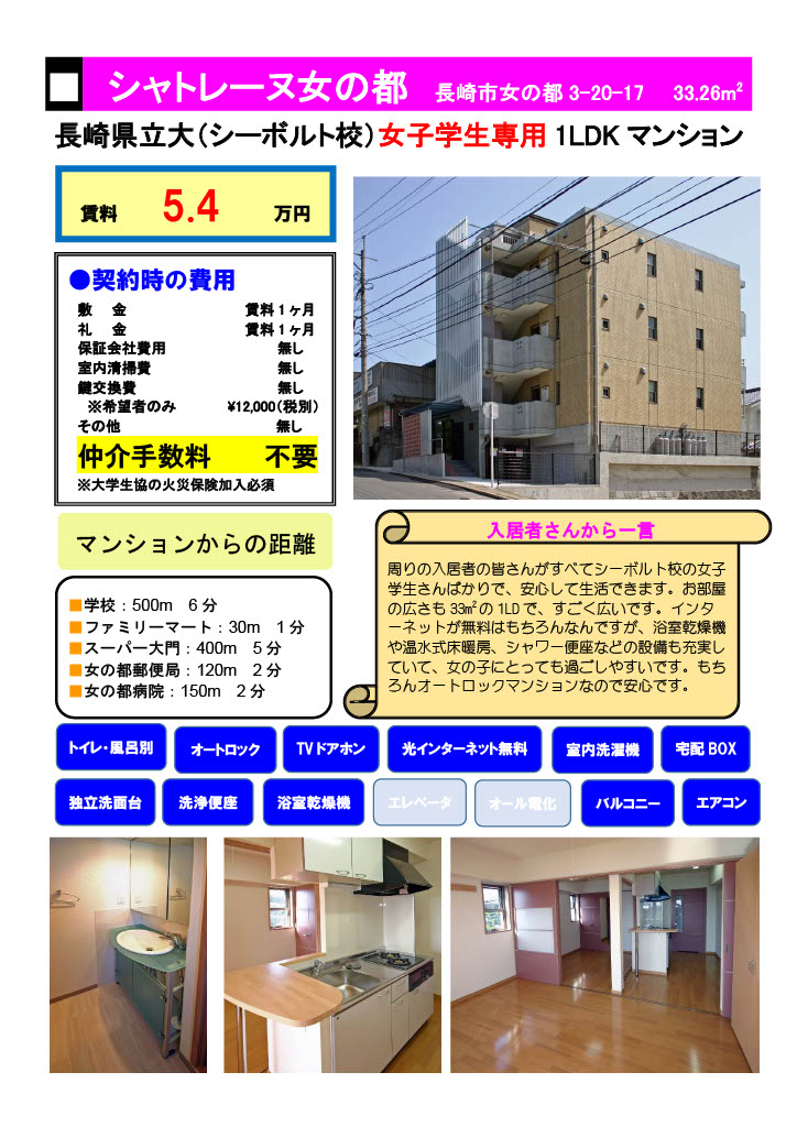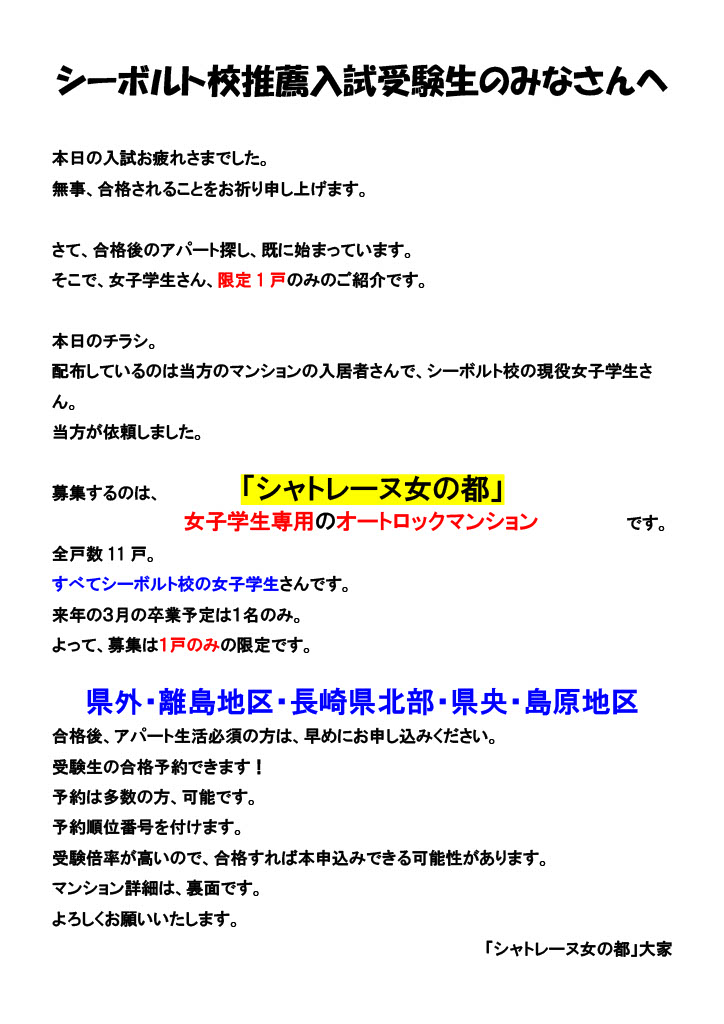 シ―ボルト校で推薦入試が実施されました。「シャトレーヌ女の都」の入居者で「情報セキュリティ学部」の学生さんに、入居者募集のチラシを配布して頂きました。 残念ながら貰っていない受験生の方は、下記でパンフの内容をご覧ください。