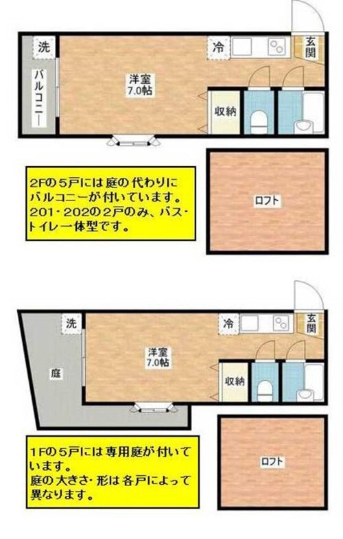 なお、201と202号室はバストイレ一体型そのままです。その分、家 賃を少し安めに設定しています。